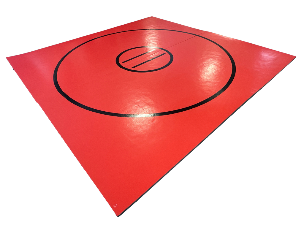 Clearance 12' x 12' x 1 3/8" Roll-Up Wrestling Mat -Red Mat with Black Circles and Lines